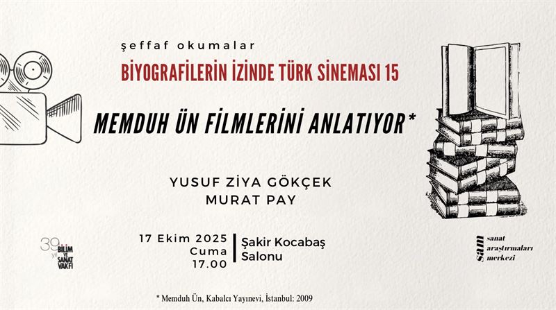 "Şeffaf Okumalar - Biyografilerin İzinde Türk Sineması 15: Memduh Ün Filmlerini Anlatıyor" başlığını taşıyan dizinin on beşinci programı 17 Ekim 2025 Cumartesi 17:30'da Şakir Kocabaş Salonu'nda gerçekleştirilecek. Programda Memduh Ün Filmlerini Anlatıyor isimli kitap ele alınacaktır.