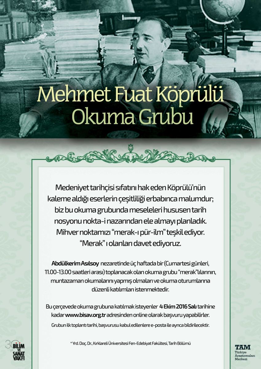 Medeniyet tarihçisi sıfatını hak eden Köprülü’nün kaleme aldığı eserlerin çeşitliliği erbabınca malumdur; biz bu okuma grubunda meseleleri hususen tarih nosyonu nokta-i nazarından ele almayı planladık. Mihver noktamızı “merak-ı pür-ilm” teşkil ediyor. Sadece “merak”ı olanlarla hem-dertleşmeye sizleri davet ediyoruz.